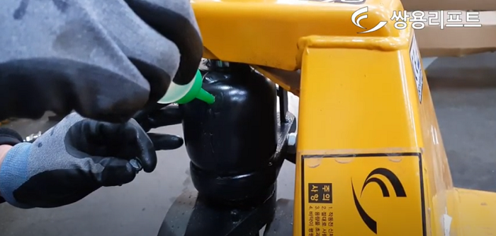 - Dùng bình nhỏ bơm dầu thủy lực xe nâng vào, nhớ thực hiện từ từ tránh tràn dầu, mức dầu khoảng hơn nửa bình là xe đã có thể hoạt động trơn tru.