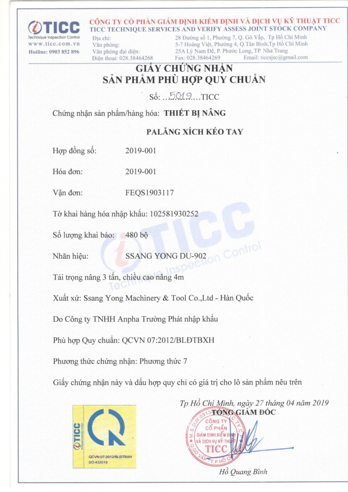 chứng nhận chất lượng pa lăng xích tay ssangyong