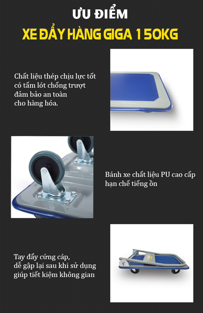 - Mặt trên của xe gấp gọn có dán lớp vân nhựa chống trơn trượt, vui lòng không đặt hàng hóa nhiệt độ cao lên xe.