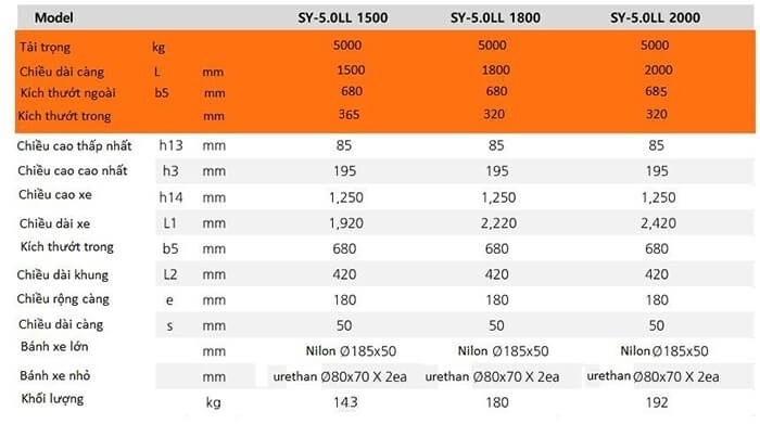 Thông số kĩ thuật các xe nâng tay càng dài 5 tấn Ssangyong:
